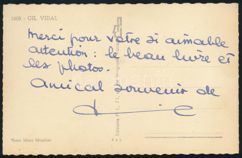 Gil Vidal (1931-) francia színész dedikált fotólapja