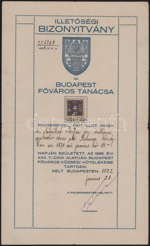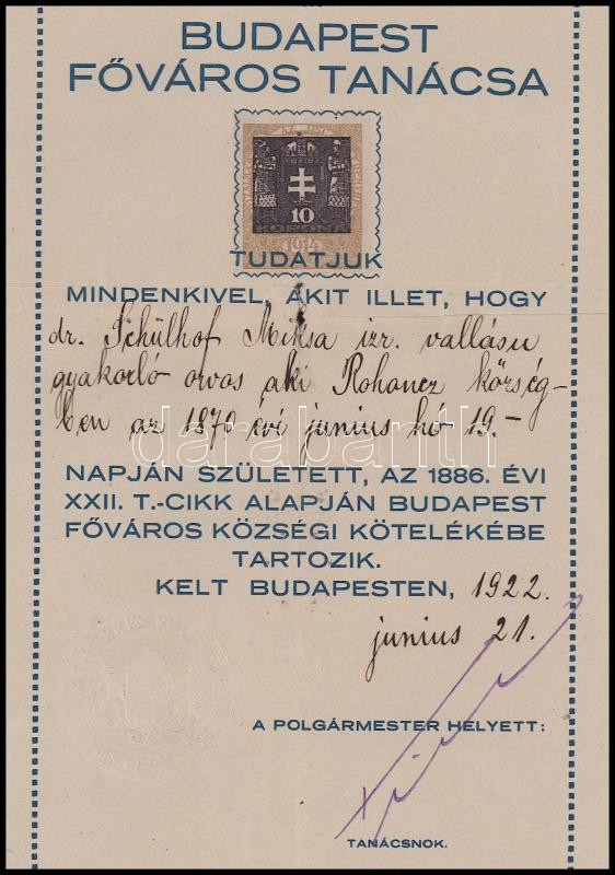 1922 Budapest Főváros Tanácsa által kiállított illetőségi bizonyítvány Schulhof Miksa (1870-1945) izraelita vallású orvos részére, 10K okmánybélyeggel, szárazbélyegzővel, 33x20 cm
