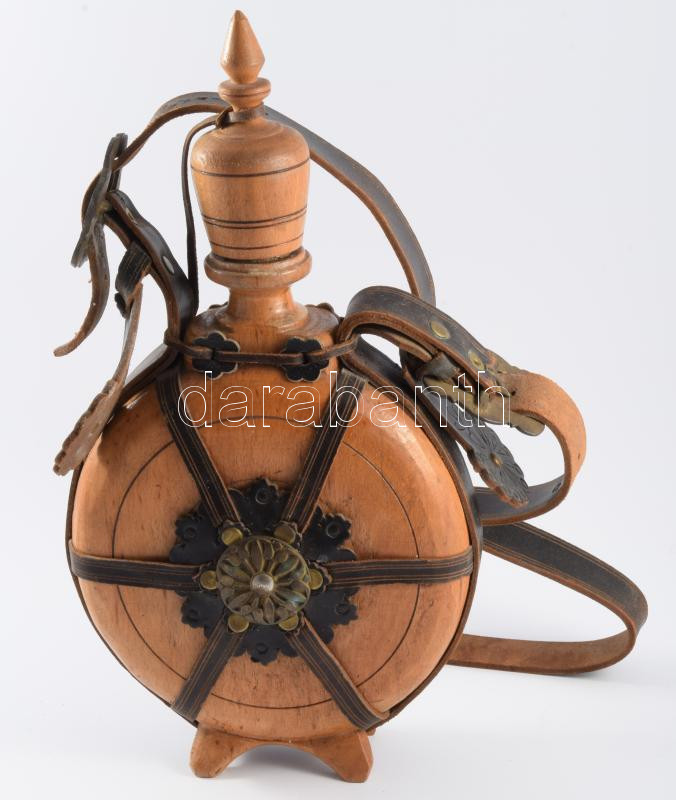Bőr szerelékes fa kulacs, m: 32 cm