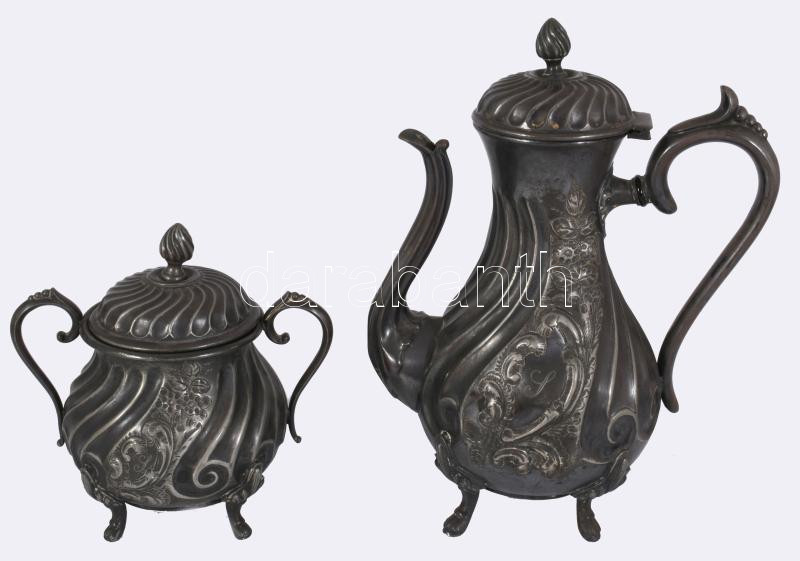 Ezüstözött fém teás kanna és cukortartó, jelzett, sérült zsanérral, m: 27 cm alatt