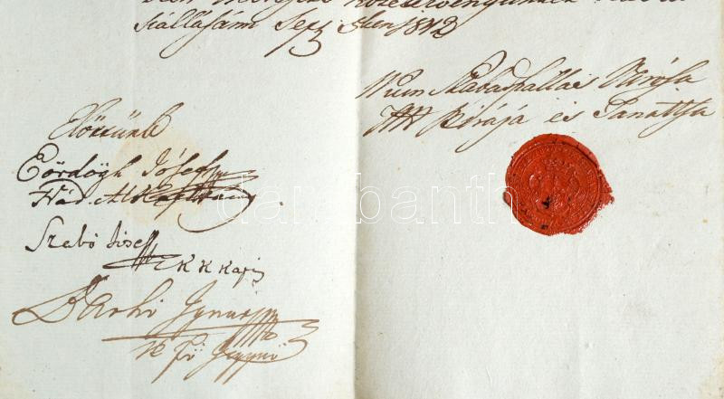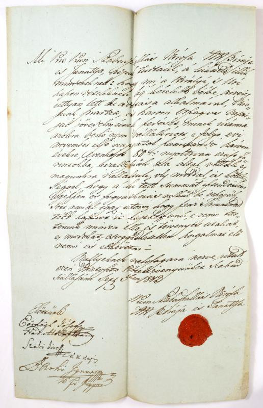 1848 Kiskunszabadszállás város szerződése a városi vásárok királyi és úri haszonvételek három éves bérbe adásáról A városi elöljárók aláírásával és a város címeres pecsétjével.