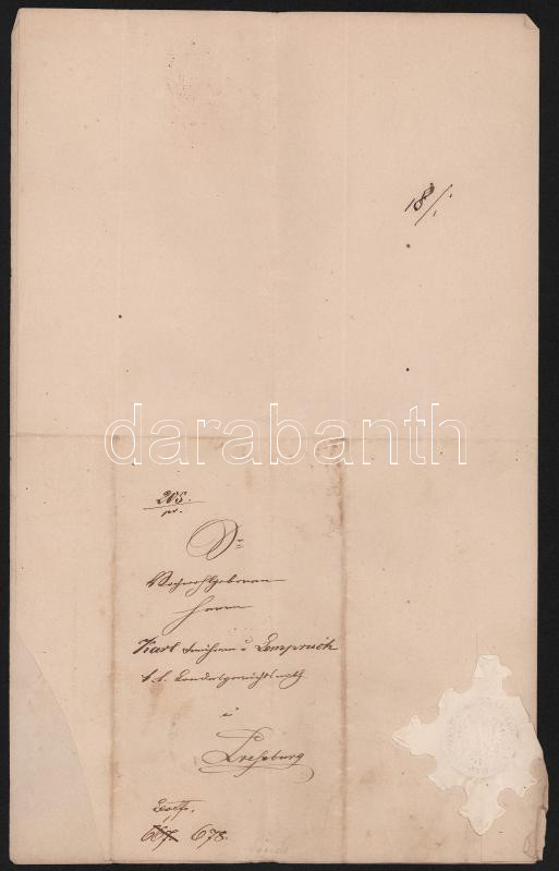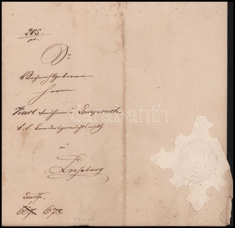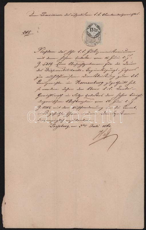1861 Karl Freiherr von Lempruch osztrák tábornok részére szóló hivatalos levél Pozsonyból
