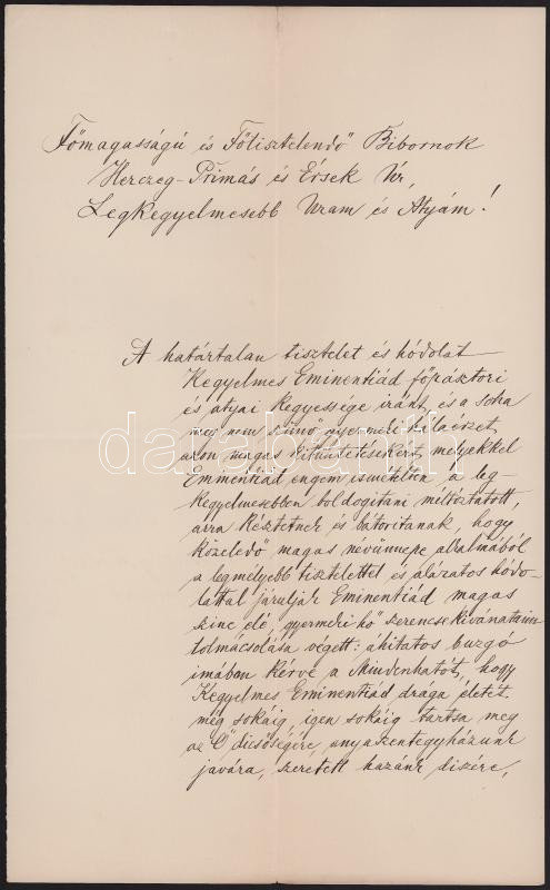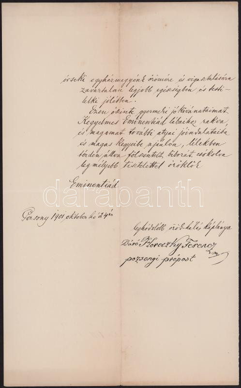 1901 Horkai báró Horeczky Ferenc (1819-1904) pozsonyi (Felvidék) prépost-kanonok saját kézzel aláírt, öregség miatt írnok által kézzel írt üdvözlő levele Vaszary Kolos bíborosnak névnapja alkalmából, hajtott, jó állapotban, 2p