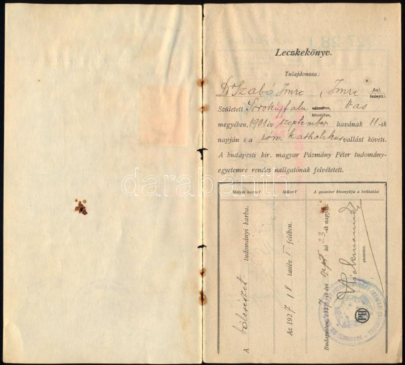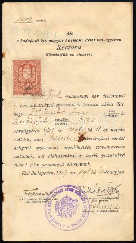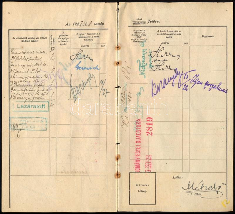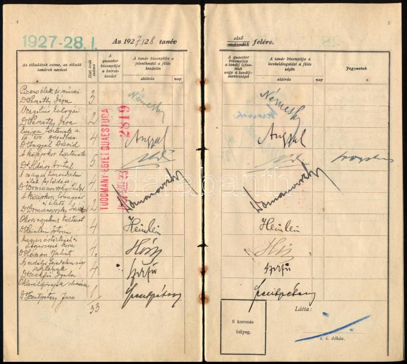 1927 A Budapesti Kir. M. Pázmány Péter Tudományegyetem töredékes leckekönyve (4 lap), több neves akadémikus, egyetemi tanár aláírásával: Áldásy Antal, Szekfű Gyula, Hóman Bálint, Fináczy Ernő, Némethy Géza, Domonovszky Sándor, Méhely Lajos, Hekler Antal, Heinlein István és mások