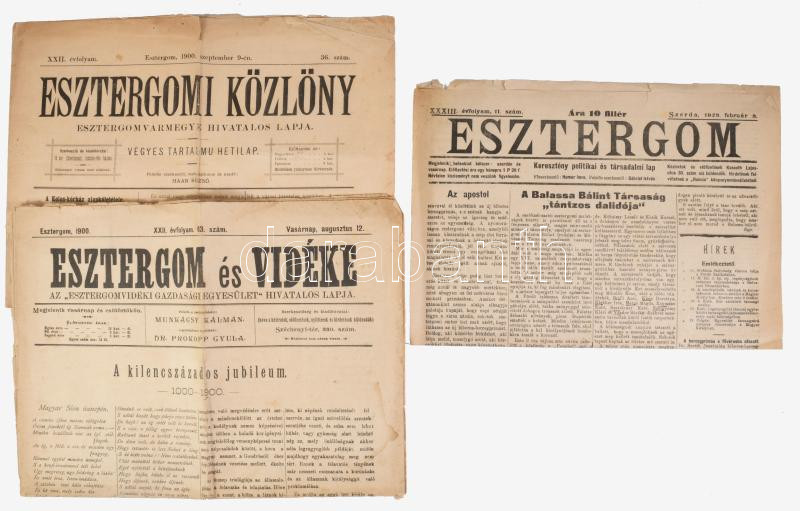 1900-1928 Az Esztergom és Vidéke, az Esztergomi Közlöny és az Esztergom című újság egy-egy száma