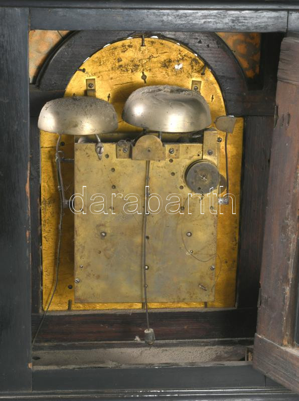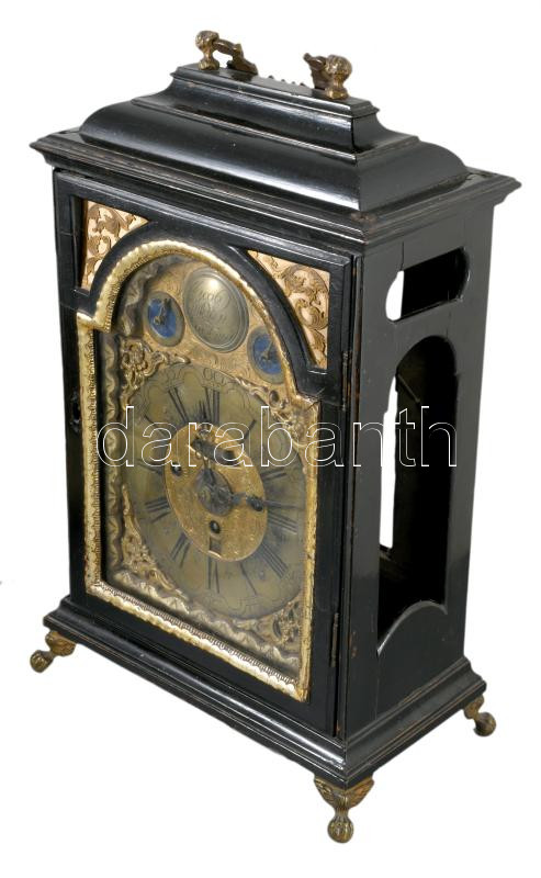Szekrényóra, (kandallóóra) XVIII. sz. Pozsony, "Jacob Gulden Pressburg" órásmester felirattal, negyedet csengÅ‘re ütÅ‘ bécsi óraszerkezet, egynapos ingajárat, vésett, gilosált réz, római számos számlap, festett fa házban, préselt réz dÃszekkel, kulccsal nyitható óraház (kulcsok megvannak). Kissé sérült tokkal, de meglévÅ‘ dÃszekkel. MűködÅ‘, de javÃtásra szoruló szerkezettel m: 50 cm, sz: 27 cm / Antique chandellier or cupboard clock. 18th century Pressburg (Bratislava SK) with copper dial and upper field Signed: Jacob Gulden Pressburg. Strikes quarter. Works, but needs mending 50 cm