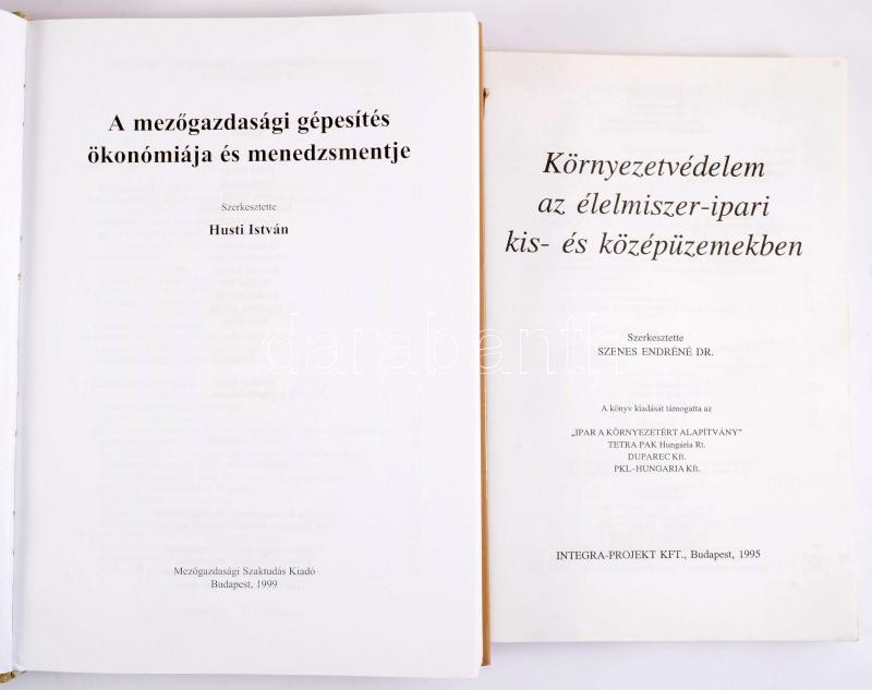 Környezetvédelem az élelmiszeripari üzemekben kis- és középüzemekben. Szerk.: Szenes Endréné. TermelÅ‘k Kiskönyvtára 9. Bp., 1995, Integra-Projekt Kft. Kiadói papÃrkötés. + Husti István: A mezÅ‘gazdasági gépesÃtés ökonómiája és menedzsmentje. Szerk.: - -. Bp., 1999, MezÅ‘gazdasági Szaktudás Kiadó. Kiadói kartonált papÃrkötés.