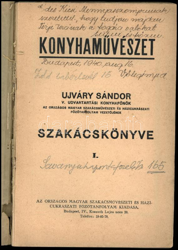 Ujváry Sándor: Konyhaművészet. - - szakácskönyve I. Bp., [1939], Országos Magyar Szakácsművészeti és Házicukrászati Főzőtanfolyam, 240 p. Kiadói papírkötés, kissé viseltes borítóval, sérült gerinccel, ajándékozási bejegyzéssel.