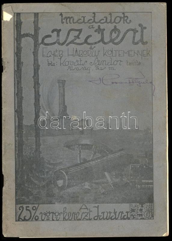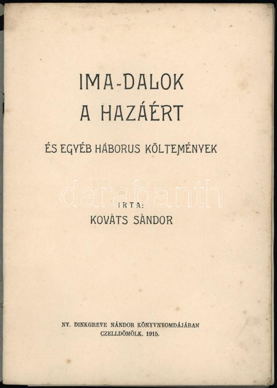 Kováts Sándor: Ima-dalok a hazáért és egyéb háborus költemények. Celldömölk, 1915, Dinkgreve Nándor-ny., 31+[1] p. Kiadói tűzött papírkötés, kissé viseltes, sérült borítóval, helyenként minimálisan foltos lapokkal, tulajdonosi névbejegyzéssel. Ritka!