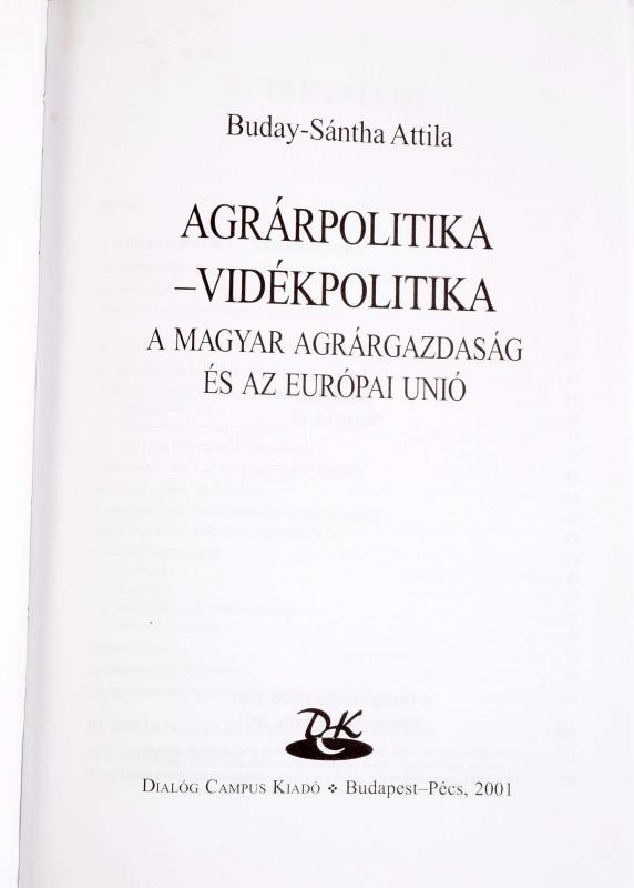 Buday-Sántha Attila: Agrárpolitika - Vidékpolitika. A magyar agrárgazdaság és az EU. Bp.-Pécs, 2001, Dialóg Campus. Kiadói kartonált papírkötés.