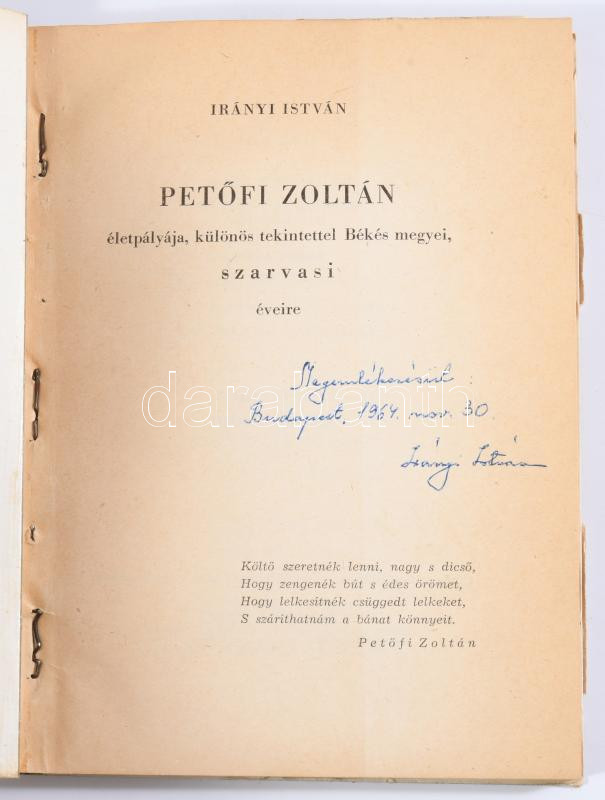 Irányi István: Petőfi Zoltán életpályája, különös tekintettel Békés megyei, szarvasi éveire. DEDIKÁLT! Szarvasi Füzetek 4. Szarvas, 1964.,Szarvas Község Tanácsa VB.,212 p. A tanárok arcképeit Ruzicskay György festőművész rajzolta. A borító illusztrációja Cs. Pataj Mihály (Cs. Pataj Mihály) (1921-2008) festő, grafikus munkája. Megjelent 1000 példányban. Kiadói papírkötés, sérült kiadói papír védőborítóban, az utolsó lap szakadt, sérült.