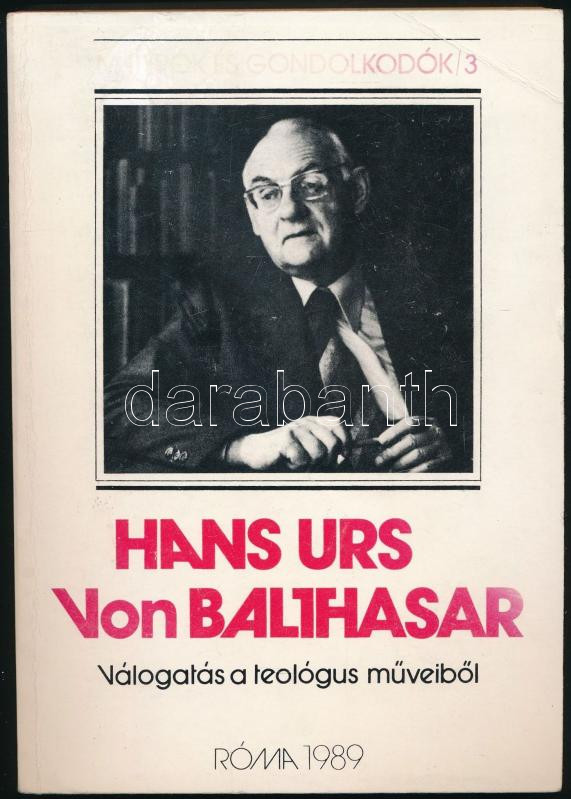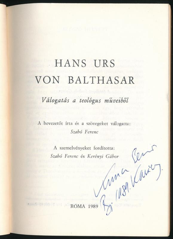 Hans Urs von Balthasar. Válogatás a teológus műveiből. A bevezetőt írta és a szövegeket válogatta: Szabó Ferenc. Róma, 1989. 235p. Kiadói papírkötés, ceruzás aláhúzásokkal, kissé kopottas állapotban.