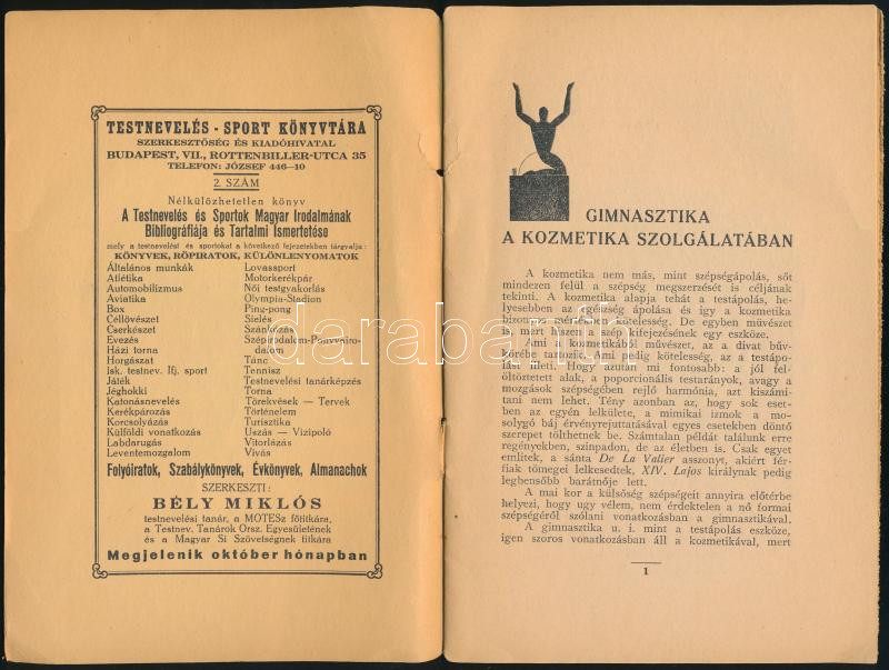 Bély Miklós: Gimnasztika a kozmetika szolgálatában. Testnevelés - Sport Könyvtára 1. szám. Bp., 1929. 16p. Kiadói papírkötés, kopottas állapotban.