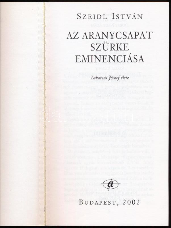 Szeidl István: Az Aranycsapat szürke eminenciás. Zakariás József élete. Bp., 2002, B-Humanitas. 183p. Kiadói papírkötés, jó állapotban.