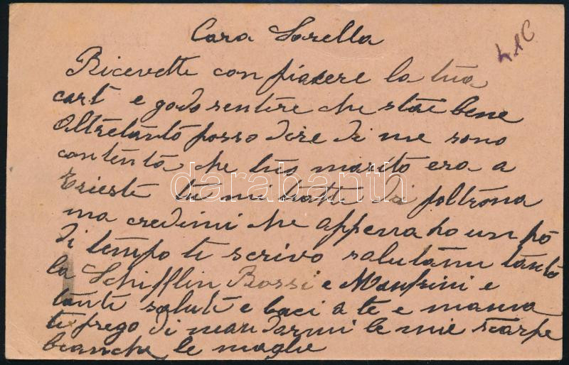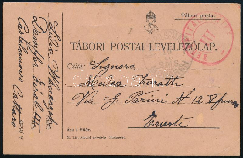 1916 Tábori posta levelezőlap piros "SEESPITALSCHIFF" , "K.u.K. KRIEGSMARINE / S.M.S. MONARCH" Triestre küldve