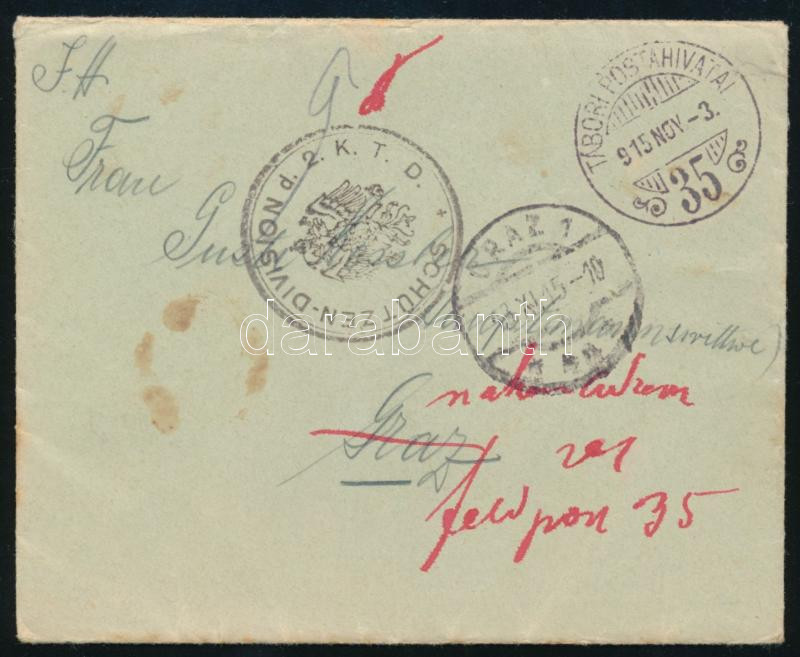 1915 Tábori posta levél tartalommal "SCHÜTZEN-DIVISION d. 2.K.T.D." + "TP 35"