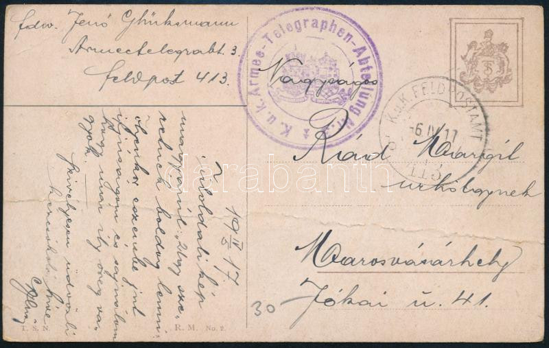 1917 Tábori posta képeslap "K.u.k. Armee-Telegraphen Abteilung Nr.3." + "FP 413 b"