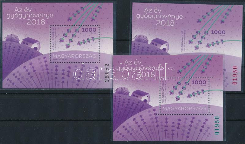 2018 Levendula 3 klf blokk: alap + zöld sorszámmal + vágott piros sorszámmal (a zöld és piros azonos) (19.000)