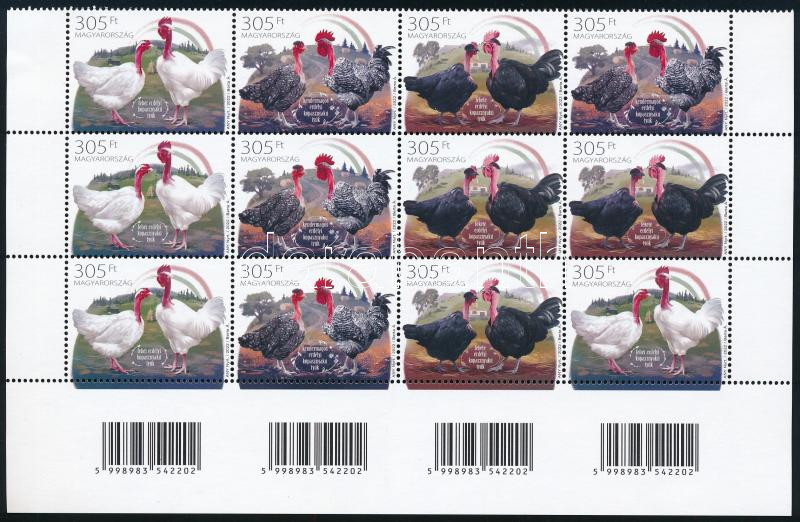 2022 Őshonos magyar baromfifajták I. ívsarki vonalkódos 12-es tömb, összesen 4 db sorral