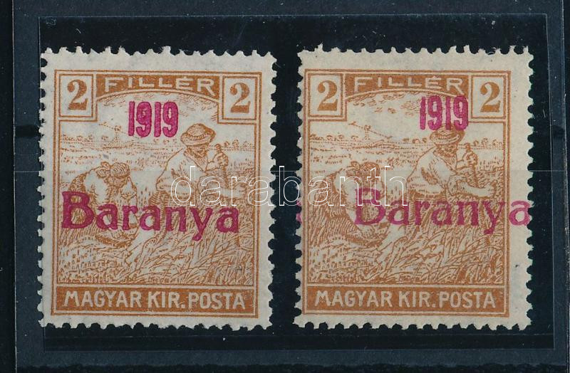 Baranya I. 1919 Arató 2 db 2f eltolódott felülnyomással, Bodor vizsgálójellel