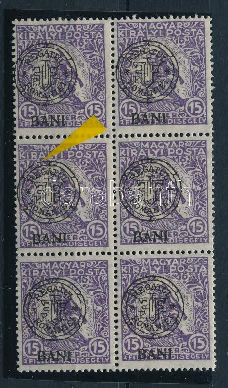 Kolozsvár 1919 Hadisegély 15f 6-os tömbben, benne kihasadt kör lemezhiba, Bodor vizsgálójellel