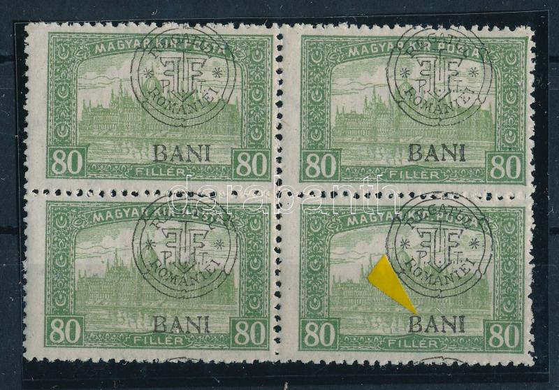 Kolozsvár 1919 Parlament 80f 4-es tömbben lemezhibával, eltolódott felülnyomással, Bodor vizsgálójellel