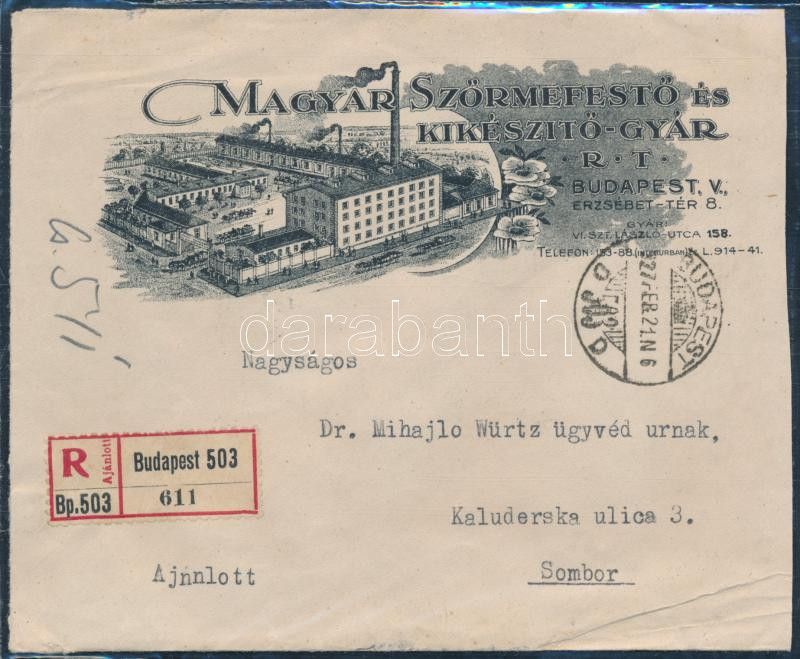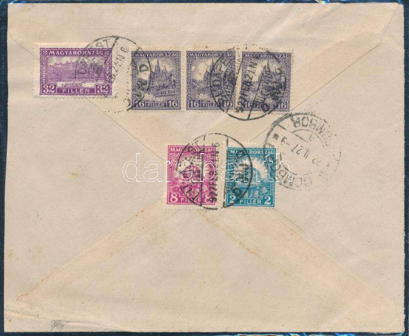 1927 Ajánlott levél 6 db bélyeggel / Registered cover with 6 stamps "BUDAPEST" - Sombor