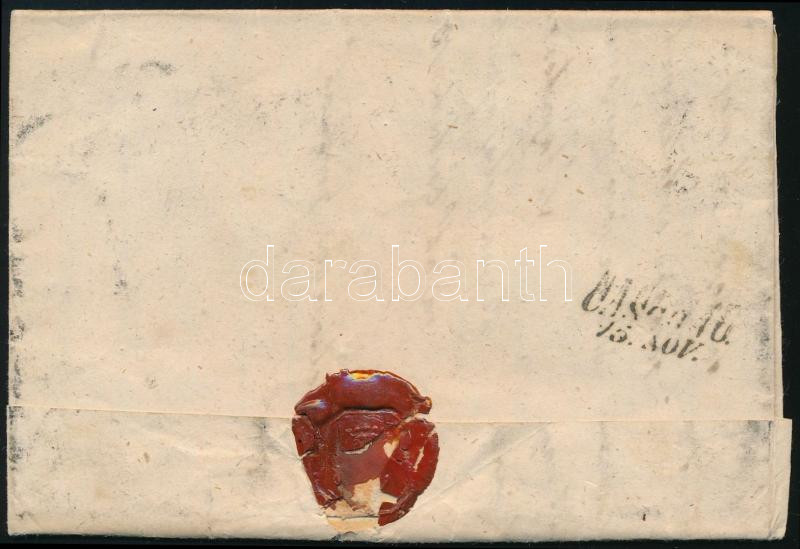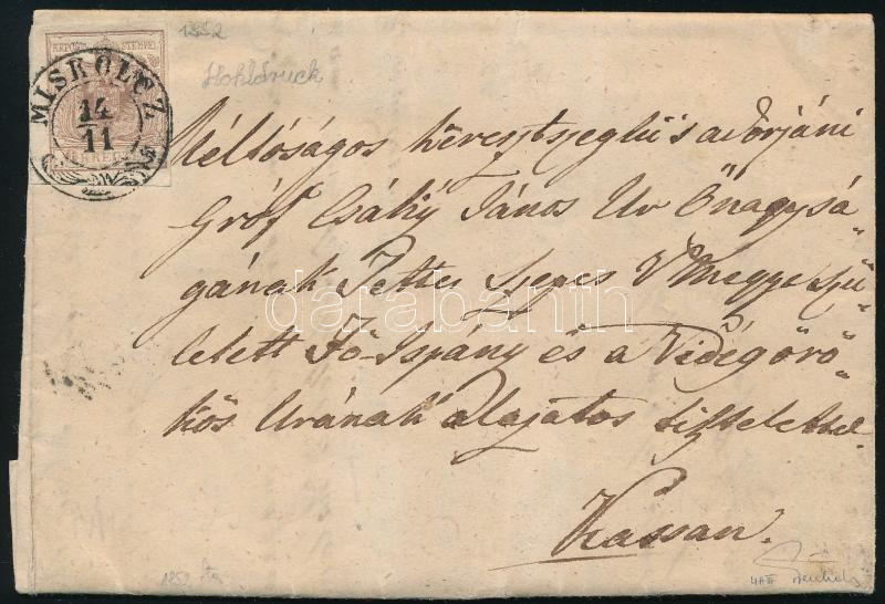 1852 6kr HP III. üreges nyomat levélen, teljes tartalommal "MISKOLCZ" - "CASCHAU" Sign: Ferchenbauer