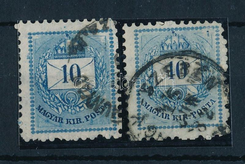 1881 2 x 10kr jobb felső háromszögnél nyomólemez kitörés, a kitörés vésésjavítása a sarokban és a mellette lévő háromszögben, ritka!