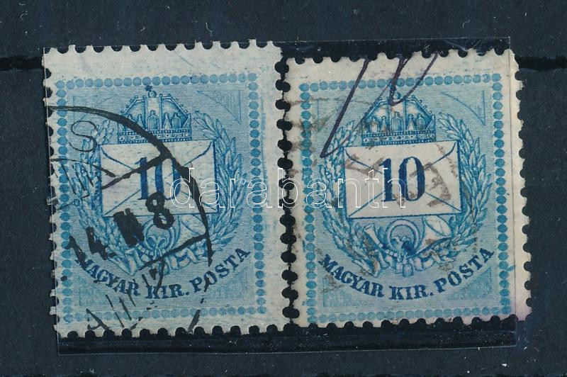 1881 2 x 10kr vésésjavítás a háromszögekben, függőleges vonalak keretvonal (nyomat), a borítékon karc, látványos folt a kürt bojtja felett