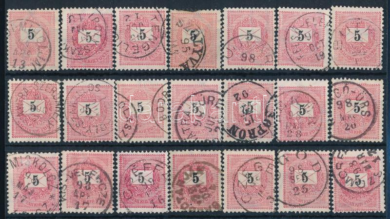 1889 21 db feketeszámú 5kr bélyeg háttérvonalkázás nélküli papíron, szép egykörös bélyegzésekkel