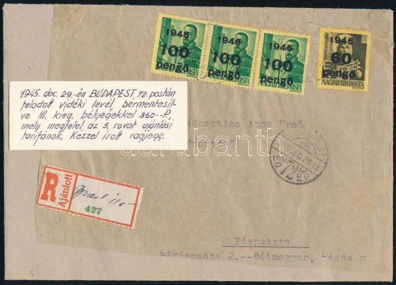 1945 (5. díjszabás) Ajánlott levél előlapja borítékra felragasztva, 4 bélyeges bérmentesítéssel Budapestről Fáspusztára, szükség ragjeggyel