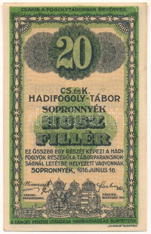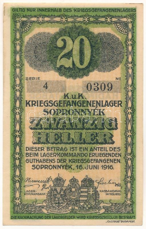 1916. Sopronnyék / hadifogolytábor 1916. június 16. 20f arab sorozat- és sorszámmal "4 0309" T:AU