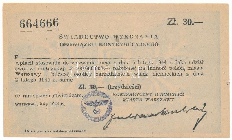 Poland / German occupation 1944. "Swiadectwo wykonania obozwiazku kontrybucyjnego (Proof of compliance with the contribution obligation)" about fully paid 30 Złoty "664666" C:AU