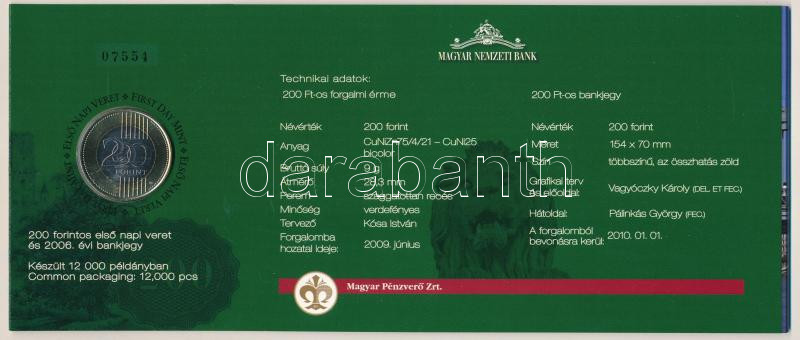 2009. 200Ft elsőnapi veret + 2006. 200Ft "FB" bankjegy "Búcsú a 200Ft-os bankjegytől", sorszámozott "07554" emléklapon T:UNC