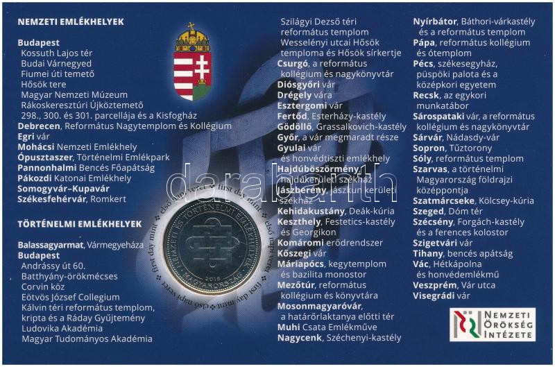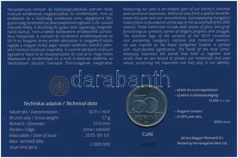2015. 50Ft Cu-Ni "Nemzeti és Történelmi Emlékhelyek" első napi veret számozott emléklapon, "02370" sorszámmal T:UNC