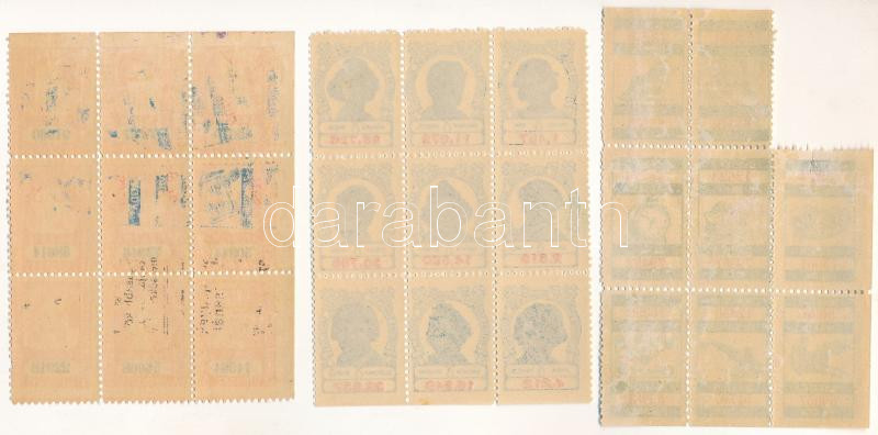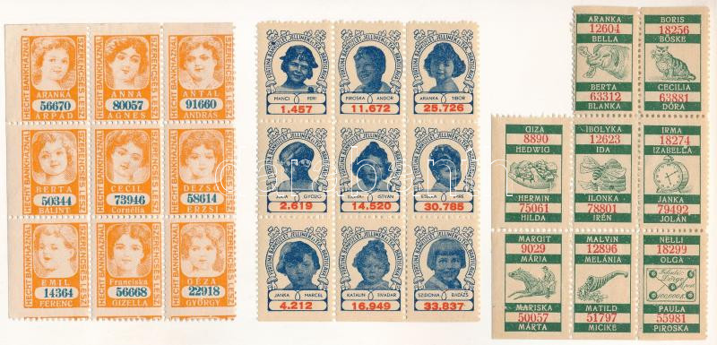 Magyarország 1920-1930k. Három darabos sorsjegy, sorsjáték bélyeg tétel, 2db 9-es tömbben + egy ívdarab. Motívumok: hölgyek, gyerekek, szerencsehozó motívumok.
