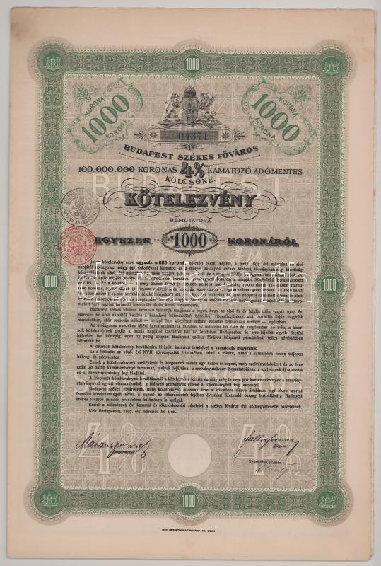 1897. Budapest "Budapest Székes Főváros" 4%-al kamatozó kölcsön kötelezvénye 1000K-ról, bélyegzéssel, szárazpecséttel és szelvényekkel, 3 nyelvű leírással T:VF