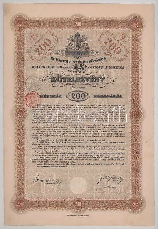 1897. Budapest "Budapest Székes Főváros" 4%-al kamatozó kölcsön kötelezvénye 200K-ról, bélyegzéssel, szárazpecséttel, 3 nyelvű leírással T:VF