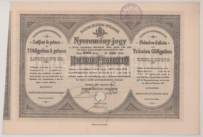 1908. Budapest "Magyar Jelzálog Hitelbank" nyeremény jegye "2883 068" T:XF