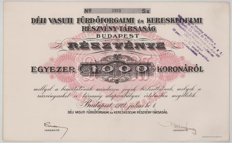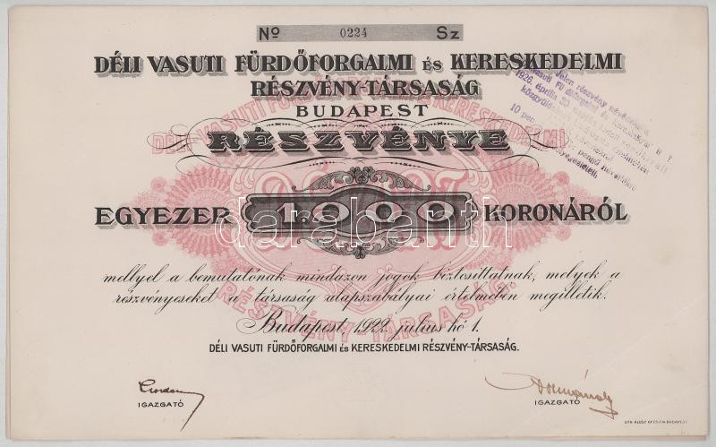 1922. Budapest "Déli Vasuti Fürdőforgalmi és Kereskedelmi Részvénytársaság Budapest" részvénye összesen 1000K-ról, (2x) sorszámkövetők "0223-0224" , szárazpecséttel, bélyegzésekkel T:XF