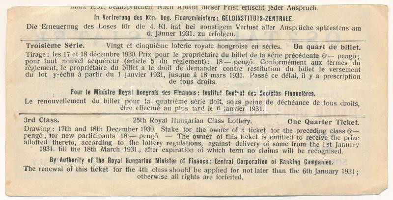 1931. "25. Magyar Királyi Osztálysorsjáték" harmadik osztály egynegyed sorsjegye bélyegzéssel, vízjeles papíron T:F a sorsjegy felső részét levágták