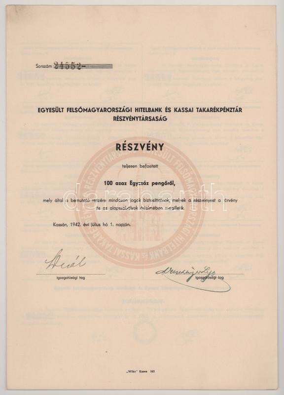 1942. Kassa "Egyesült Felsőmagyarországi Hitelbank és Kassai Takarékpénztár Részvénytársaság" részvénye 100P-ről, szelvényekkel, szárazpecséttel T:AU