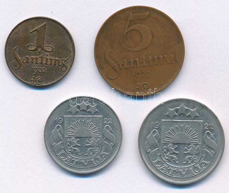 Lettország 1922. 5s bronz + 10s Ni + 20s Ni + 1932. 1s bronz T:XF