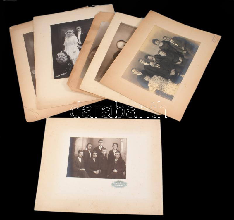 cca 1930-1940 Családi, esküvői fotók, csoportképek, 6 db nagyobb méretű, kartonra kasírozott fotó, vegyes állapotban, 28,5x37 cm-ig