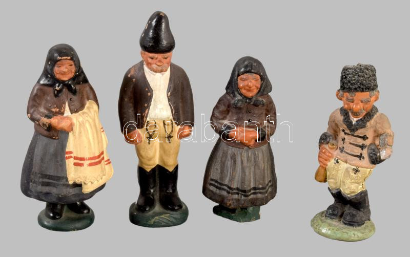 4 darab erdélyi kerámia figura, Papp Erdély és Lepage Kolozsvár jelzésekkel, cca 1900-1920, kopással, egyik figurán sérüléssel, m: 11,5 cm