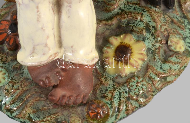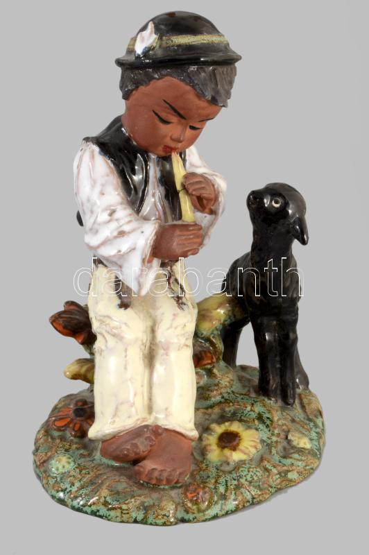 Kolozsvári Majolica báránynak furulyázó pásztorfiú. Mázas kerámia, jelzett, 1-1 sérüléssel, m: 18 cm