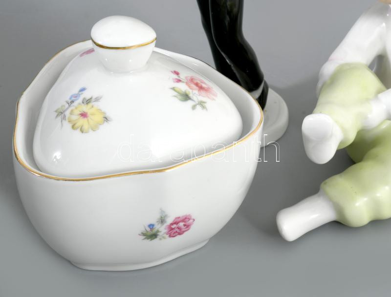 3 db Hollóházi és Aquincum porcelán figura és cukordoboz. jelzett, harmonikáson kopás