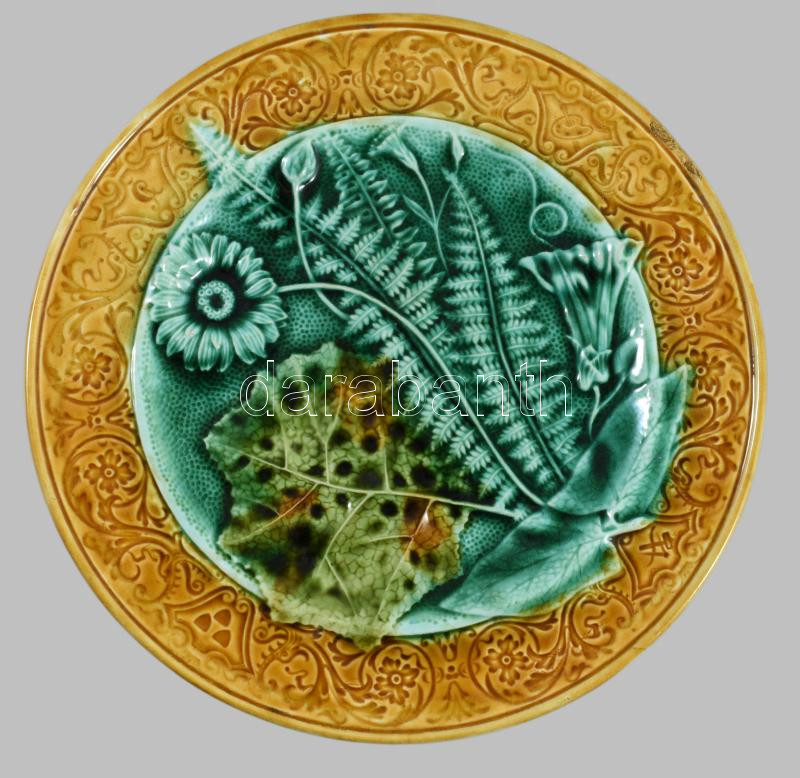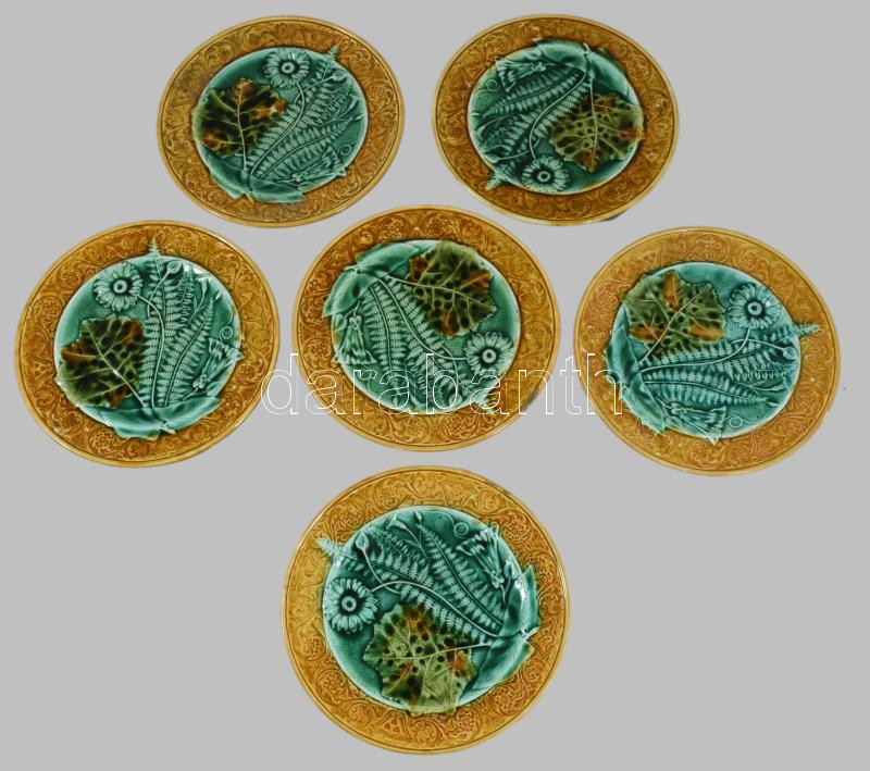 6 db levél mintás fajansz tányér. Kézzel festett, jelzés nélkül, kisebb mázhibákkal d: 21 cm