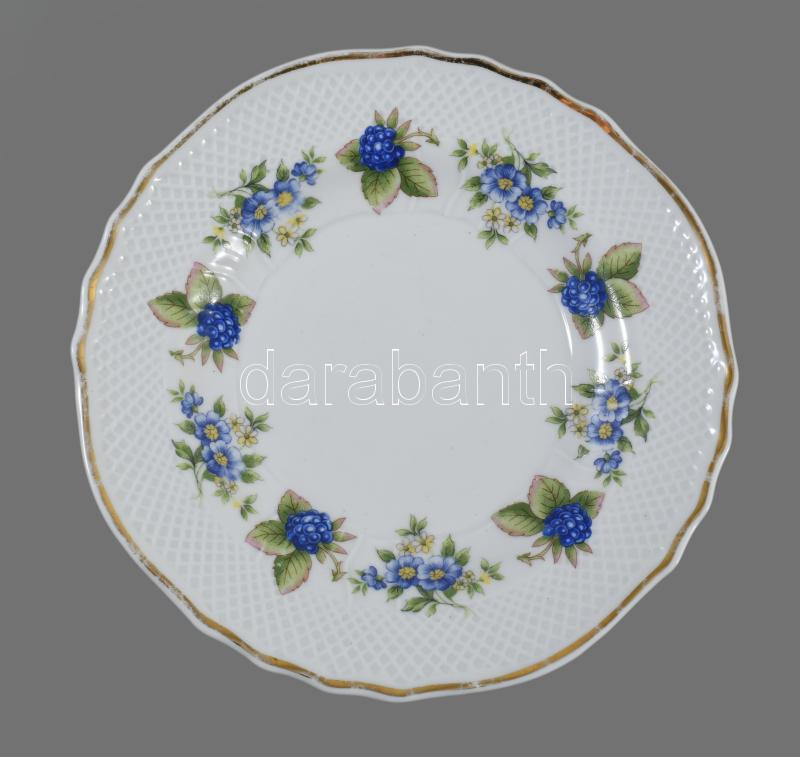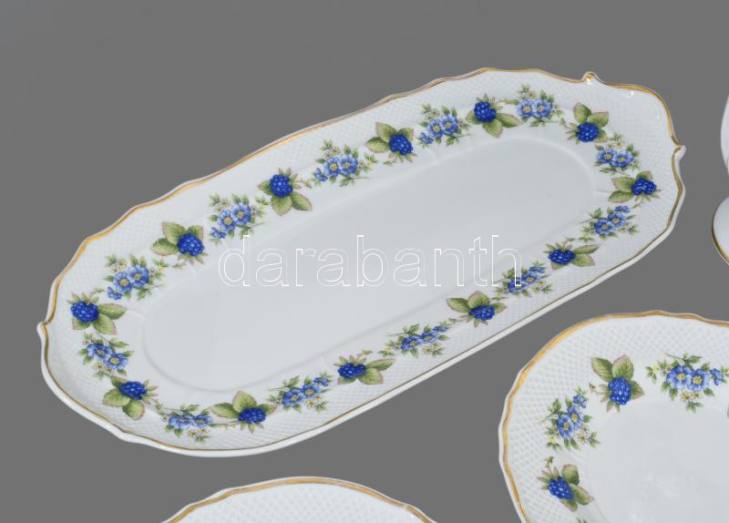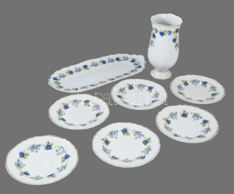 Hollóházi szedermintás süteményes készlet 39x18 cm, d: 18 cm + váza m: 21,5cm, jelzett, kis kopással.